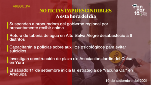 Procuradora del Gobierno Regional es suspendida. Arequipa. Notas imprescindibles. 10 de septiembre de 2021 La procuradora del Gobierno Regional de Arequipa, Rosa Vallejos, fue suspendida de sus funciones por