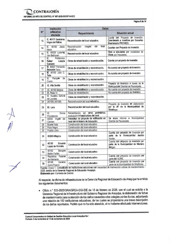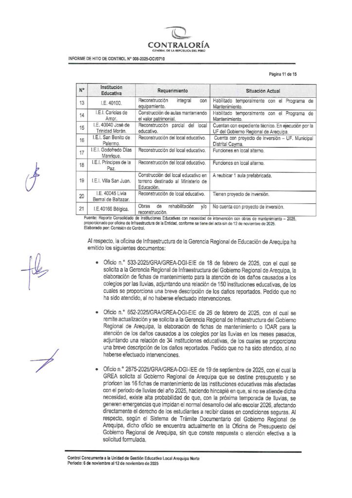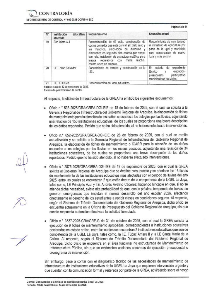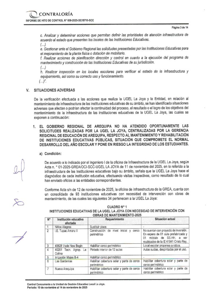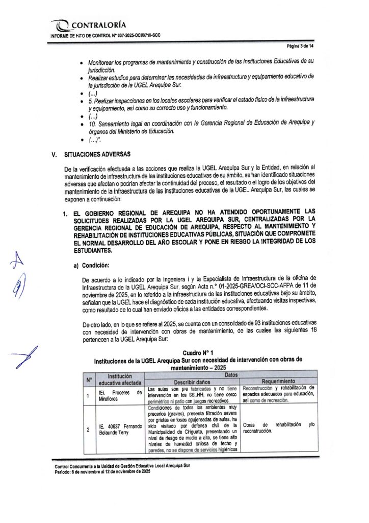 Tres informes de Contraloría evidencian que el Gobierno Regional de Arequipa ignoró documentos reiterativos de la Gerencia Regional de Educación de Arequipa (GREA) en los que solicitaba formalmente la intervención urgente de Instituciones Educativas dañadas por la última temporada de lluvias. Esta omisión viene afectando a por lo menos 23 instituciones educativas de las Unidades de Gestión Educativa Arequipa Norte, Sur y La Joya. Y contando porque aún quedan pendientes informes similares del resto de ugeles de la región.