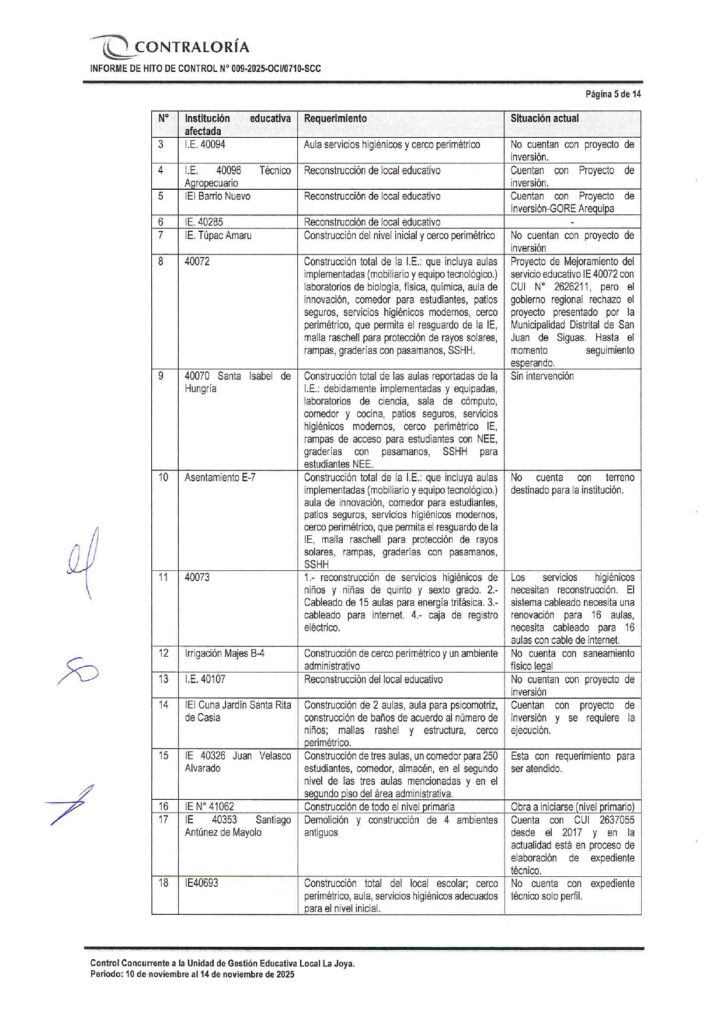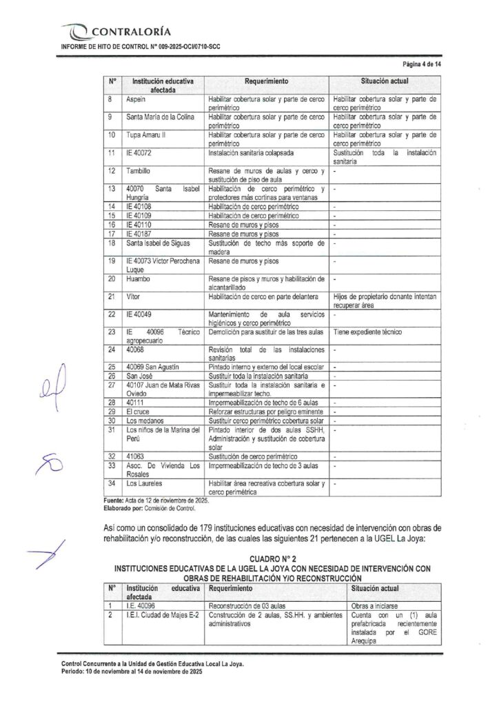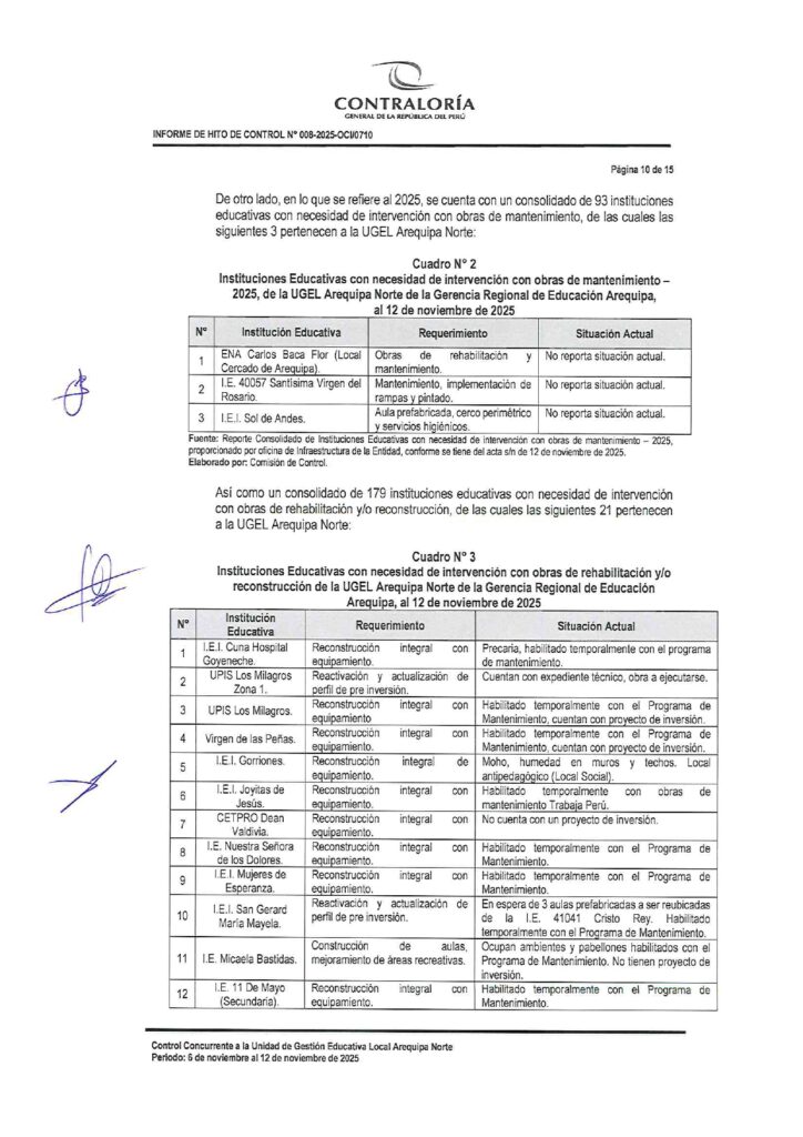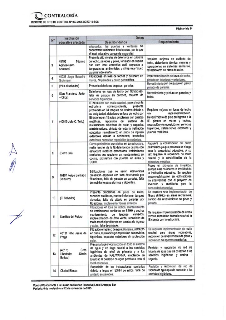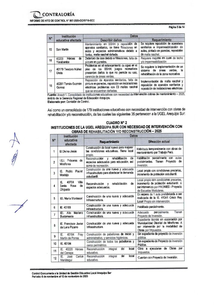 Tres informes de Contraloría evidencian que el Gobierno Regional de Arequipa ignoró documentos reiterativos de la Gerencia Regional de Educación de Arequipa (GREA) en los que solicitaba formalmente la intervención urgente de Instituciones Educativas dañadas por la última temporada de lluvias. Esta omisión viene afectando a por lo menos 23 instituciones educativas de las Unidades de Gestión Educativa Arequipa Norte, Sur y La Joya. Y contando porque aún quedan pendientes informes similares del resto de ugeles de la región.