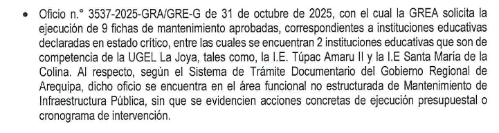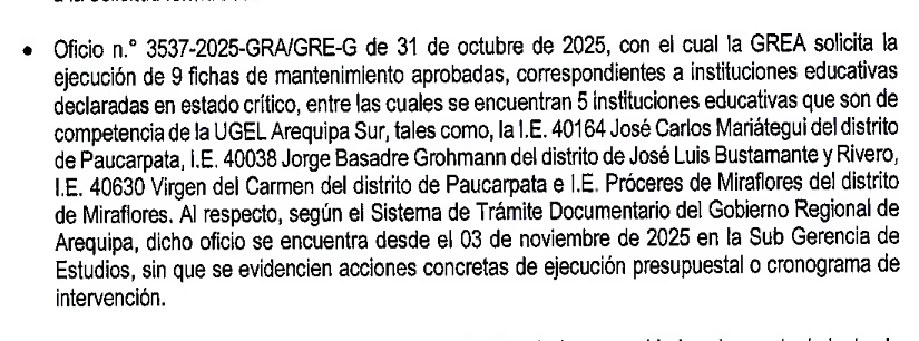 En la solicitud se describe que la Ugel Norte necesita la intervención urgente en al menos 16 instituciones educativas; en la Ugel Sur, 5 y en la Ugel La Joya, 2. El documento, de acuerdo a los informes de Contraloría citados previamente, describe que según el Sistema de Trámite Documentario del GRA, aún permanece sin ser atendido «sin que conste respuesta o atención efectiva a la solicitud formulada». En otras palabras fue ignorado hasta por lo menos el 12 de noviembre, fecha en la que culminó el periodo de evaluación de la Contraloría.