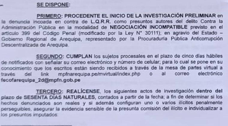 La Fiscalía Especializada en Delitos de Corrupción de Funcionarios ha dispuesto un plazo de 60 días naturales para llevar a cabo la investigación preliminar. La pesquisa se ha iniciado «contra los que resulten responsables» (L.Q.R.R.) por el presunto delito de Negociación Incompatible, una figura penal que sanciona al funcionario público que se interesa indebidamente en un contrato u operación en la que interviene por razón de su cargo. La investigación está a cargo de la fiscal Madeleine Córdova.