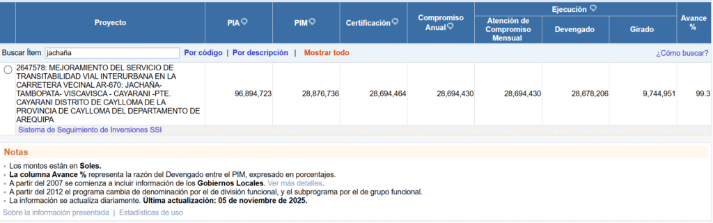 El contrato de la obra «Mejoramiento del servicio de transitabilidad vial interurbana en la carretera vecinal AA-670: Jachaña – Tambopata – Viscavisca – Cayarani – Puente Cayarani» se firmó el 17 de febrero de 2025, mediante la modalidad de Llave en Mano (Concurso Oferta). La empresa adjudicada fue el Consorcio Vial Caylloma que debía encargarse de la elaboración del expediente técnico y la ejecución de la obra por un monto que supera los 95 millones de soles.