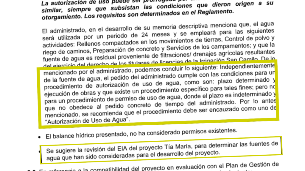 Por otro lado, en Arequipa, en lo que representó un pequeño revés temporal en las intenciones de Southern, tres semanas después, el 19 de agosto, el Secretario Técnico del Consejo de Recursos Hídricos de la Cuenca Quilca-Chili, Javier Segovia Gamio responde la consulta del ALA Tambo Alto Tambo, mediante Informe Técnico N° 0069-2024-ANA-AAA-CO-ST.CRHC.CH. El informe concluye que el pedido correspondía a una Autorización de Uso —por plazo determinado y ejecución de obras— y no a un Permiso de Uso, reiterando la obligación de adjuntar el EIA. Esto marcaba la posición de la AAA también respaldada por Fernández Bravo.
