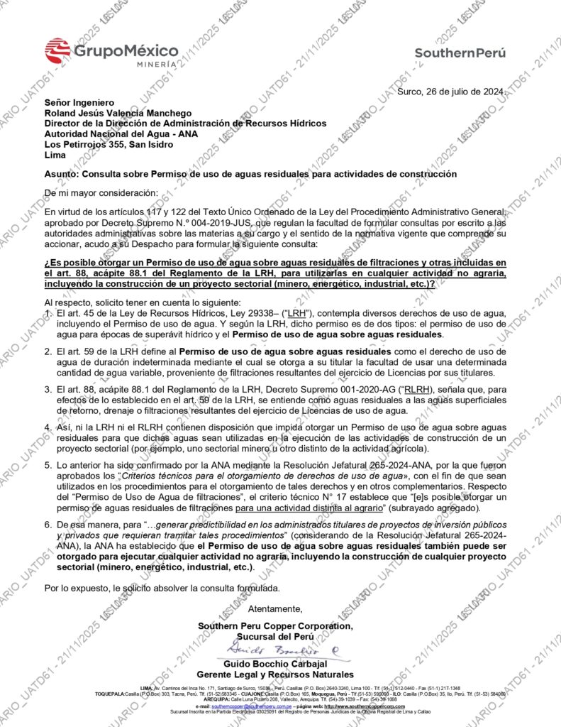 En ese contexto, el 26 de julio de 2024, la minera hizo una «Consulta sobre permiso de uso de aguas residuales para actividades de construcción» ante la Sede Central de la Autoridad Nacional del Agua. Para entonces ya había tomado conocimiento de la Resolución 265-2024-ANA, antes mencionada, y la usó para fundamentar sus preguntas.