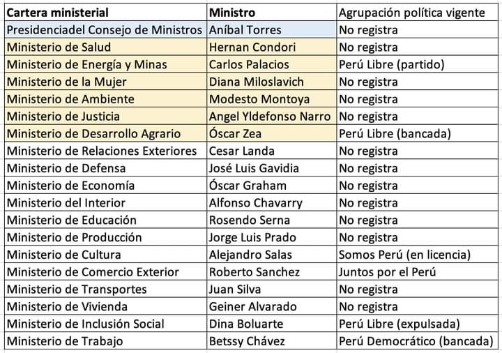 La noche del 8 de febrero del 2022 juramenta el nuevo Gabinete ministerial del gobierno de Pedro Castillo. El Titular del Consejo de Ministros es Aníbal Torres (exministro de Justicia). Es la cuarta vez que Castillo jura una cartera ministerial desde que inició su mandato.
