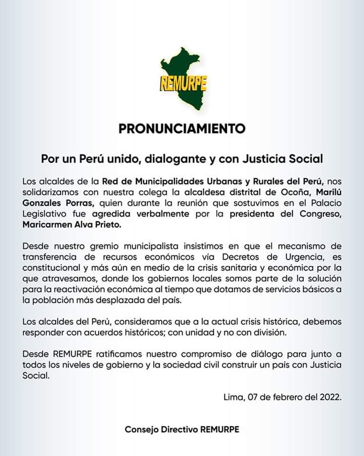 La alcaldesa de Ocoña, Marilú Gonzáles, recibe apoyo de la Red de Municipalidades Urbanas y Rurales del Perú (Remurpe). Los ediles acusan a la presidenta del Congreso, María del Carmen Alva, de agredir a la burgomaestre. Fue en una reunión entre congresistas y alcaldes la tarde del 7 de febrero del 2022.