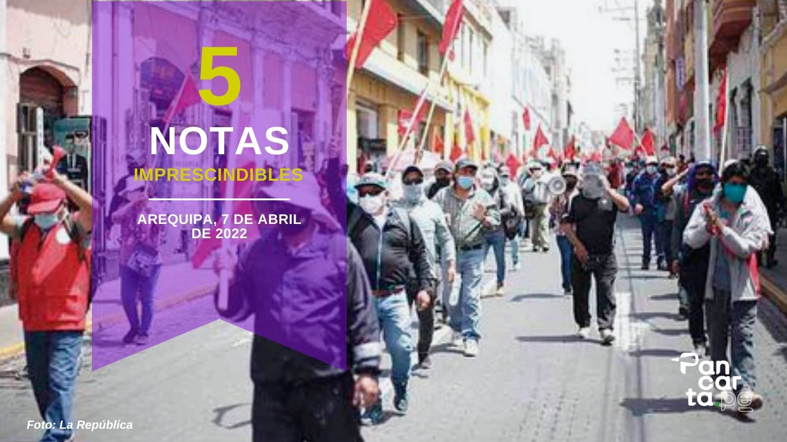 La Federación Departamental de Trabajadores de Arequipa y el Sindicato de Construcción Civil protestarán este jueves 7 de abril en contra del alza de los precios de los combustibles y los alimentos de primera necesidad. Revisa esta y otras notas imprescindibles en nuestro resumen diario de noticias para empezar el día informado.