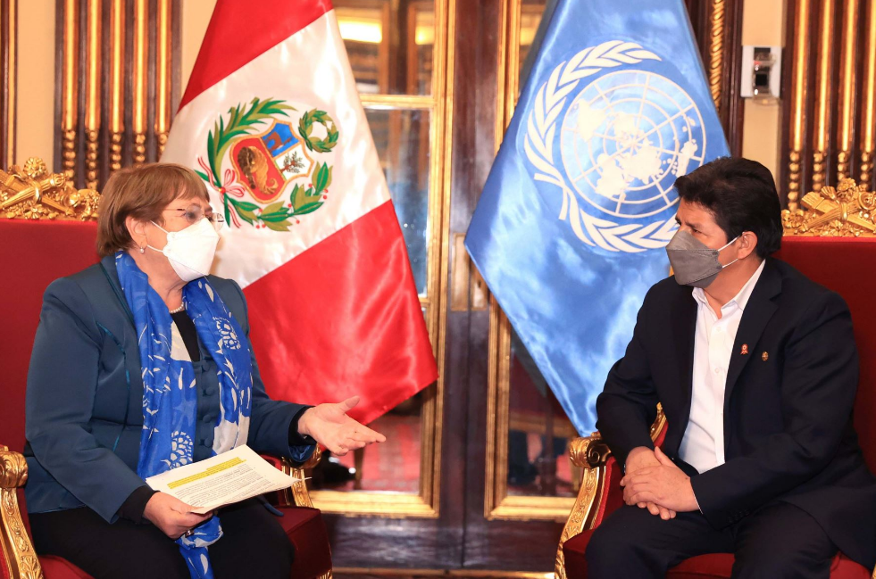 El presidente Pedro Castillo se reunió con la alta comisionada de las Naciones Unidas, Michelle Bachelet, la mañana del 19 de julio. La reunión tuvo como objetivo fortalecer las capacidades en los distintos sectores del Estado mediante el incremento de cooperación para reforzar el enfoque de derechos humanos en el diseño e implementación de planes y programas nacionales.