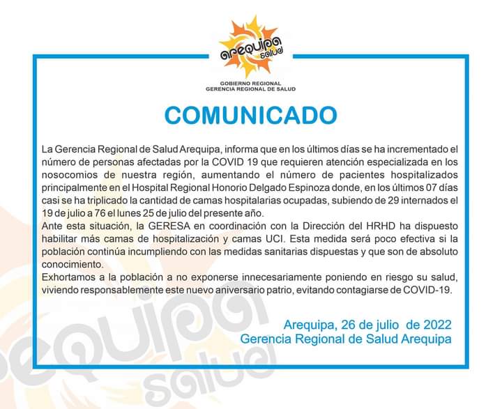 Mediante un comunicado, la Gerencia Regional de Salud de Arequipa anunció que aumentarán la el número de camas de hospitalización y camas UCI. Sin embargo, no se dio detalles de la cantidad.