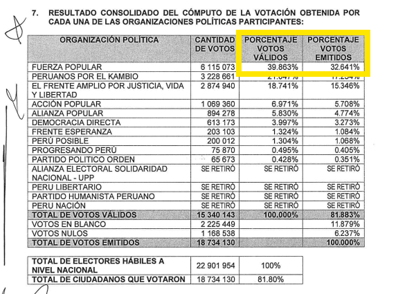 El porcentaje aludido por el candidato Mario Vizcarra solo tendría asidero si se tomara como base el total de electores habilitados, es decir, el padrón electoral. En ese caso, el porcentaje alcanzado por Keiko Fujimori es de 26,7%.