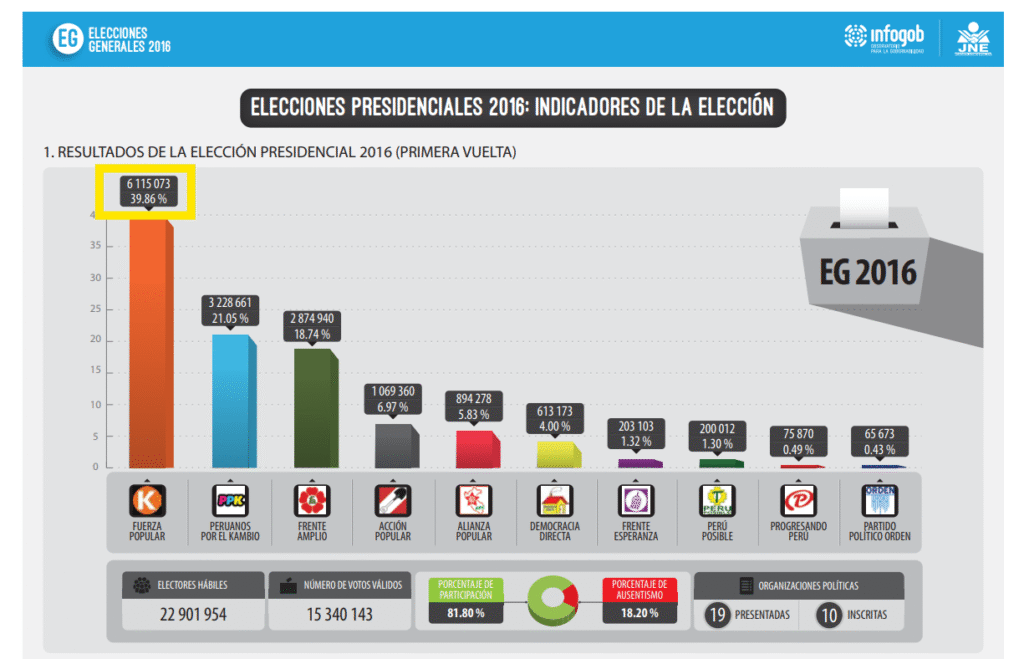 De acuerdo a este mismo reporte, en la primera vuelta, la candidata de Fuerza Popular obtuvo el 39,86% del total de votos válidos. En detalle, obtuvo 6’115.073 votos.