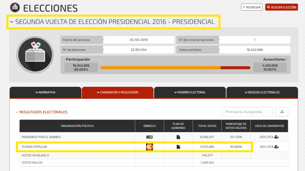 Por otro lado, en la segunda vuelta de estos comicios — realizada el 5 de junio, entre los candidatos Keiko Fujimori y Pedro Pablo Kuczynski—, la candidata de Fuerza Popular también superó el 30% del total de votos válidos.