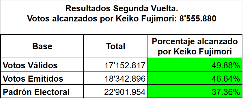 En realidad, en función al total de los votos válidos como al total de los votos emitidos, Keiko Fujimori obtuvo un porcentaje mayor al 30% en la primera y segunda vuelta durante los comicios generales del 2016.