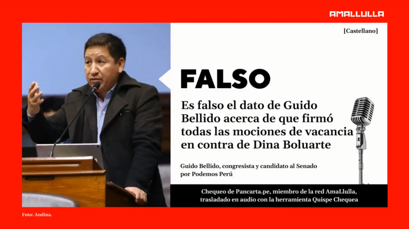 En función a lo expuesto, AmaLlulla concluye que es falsa la versión del congresista Guido Bellido acerca de que firmó todas las mociones de vacancia en contra de Dina Boluarte.