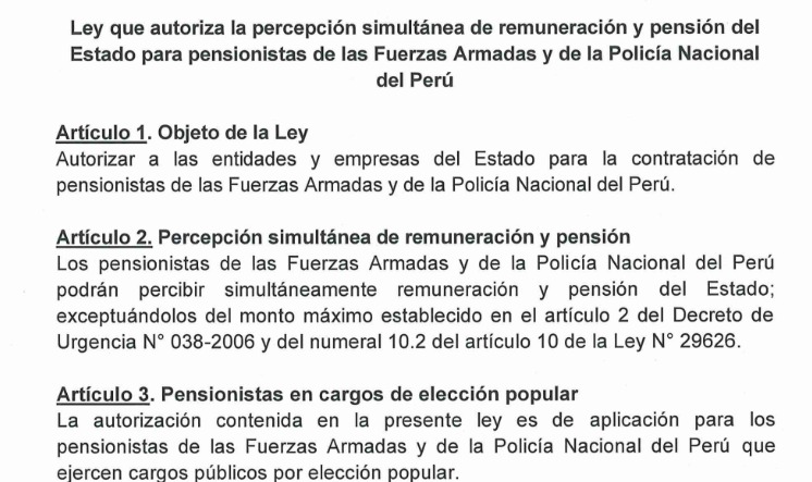 A esa fecha, solo estaba permitido que los mencionados pensionistas reciban ambos ingresos cuando trabajaban únicamente en áreas vinculadas con la seguridad ciudadana, la seguridad nacional y servicios administrativos del Estado.