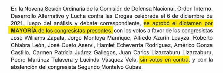 Ahora bien, contrario a lo expresado por Héctor Valer, quien señaló que fue “el único que votó en contra [de esta ley] en la Comisión de Defensa”, el registro de votos del dictamen en mención, adoptado en la novena sesión ordinaria de la Comisión de Defensa Nacional, Orden Interno, Desarrollo Alternativo y Lucha contra las Drogas, evidencia que el congresista no registró voto alguno.
