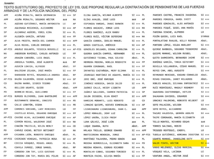 El registro de votación de la sesión deja en claro que Héctor Valer votó a favor de la aprobación de la ley.
