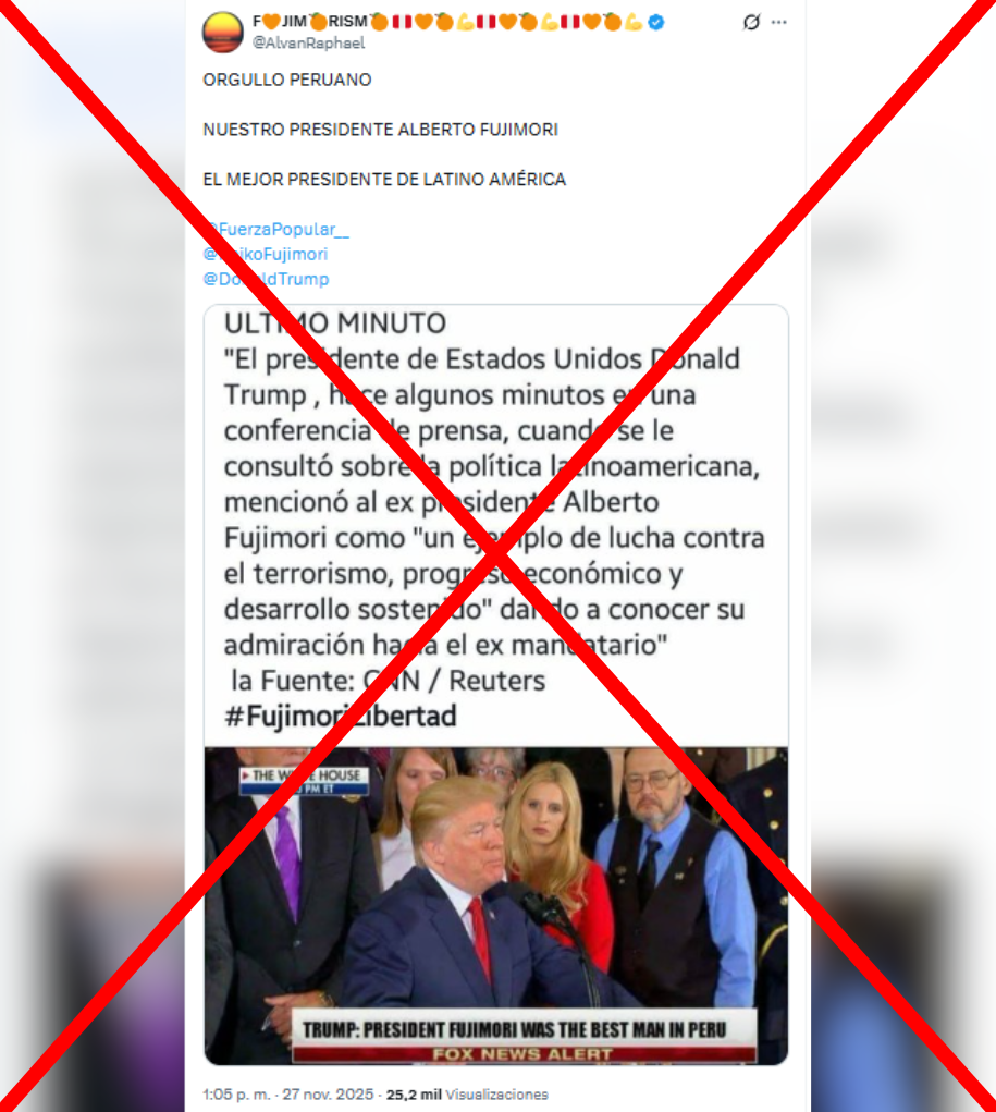 Circula en redes sociales la captura de un supuesto reporte periodístico de las cadenas CNN y Reuters acerca de que el presidente de Estados Unidos, Donald Trump, se refirió en los siguientes términos al expresidente Alberto Fujimori: “un ejemplo de lucha contra el terrorismo, progreso económico y desarrollo sostenido”.