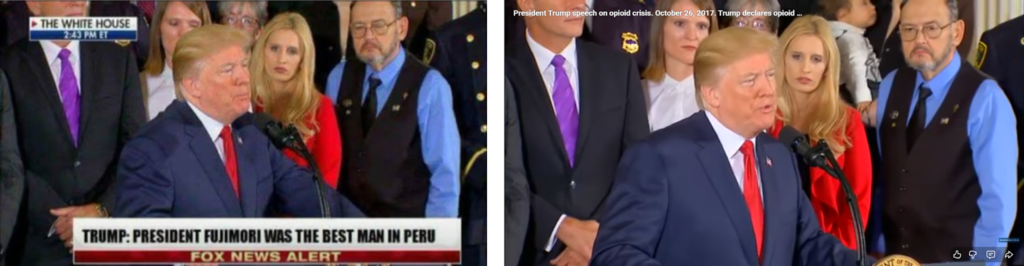 Si se hace un análisis comparativo de la fotografía que actualmente circula en redes sociales con el video de la conferencia real brindada por Trump en el 2017, se observa exactamente a las mismas personas, su misma vestimenta y su misma ubicación en el estrado en el que se desarrolló el discurso: por ejemplo, una mujer de cabello rubio y traje rojo, un hombre de camisa azulina y chaleco oscuro, ambos a la izquierda de Trump; y una persona de traje azul y corbata lila, ubicada detrás del mandatario estadounidense.
