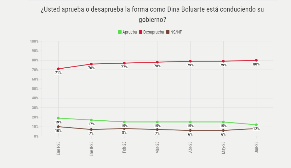 En rojo el nivel, expresado en porcentaje, de la desaprobación de la presindenta Dina Boluarte,